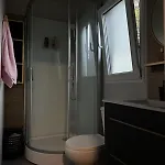 Zur Ausstattung des Badezimmers gehören auch eine Dusche.